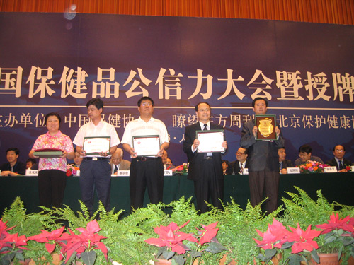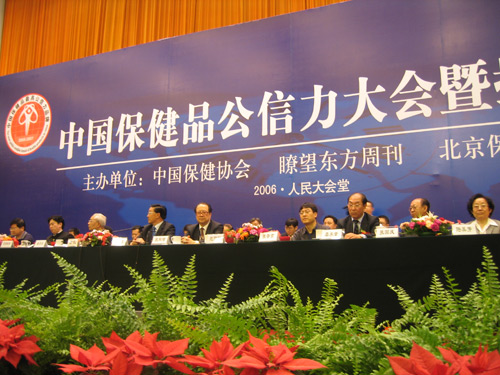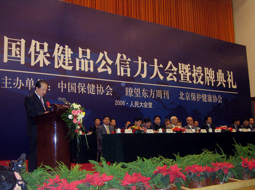 2006年5月20日上午,中国保健品公信力大会暨授牌典礼在人民大会堂隆重举行。62家企业100个公信力产品受到表彰。原全国政协副主席任建新、卫生部监督局赵同刚局长、法规司汪建荣副司长、国家食品药品监督管理局市场协调司张晋京副司长、北京市社团办李明利主任等有关部门领导以及本次会议的主办方:中国保健协会理事长张凤楼;常务副理事长潘学田;副理事长栾承章、张国庆、陆美芳;新华社《瞭望东方周刊》杂志社执行总编欧阳晓晴;北京保护健康协会张熙增会长均到会祝贺。全国保健行业优秀企业的代表共1800多人参加了本次大会。会议由中国保健协会副秘书长周邦勇主持。
