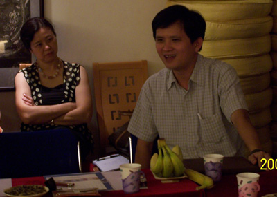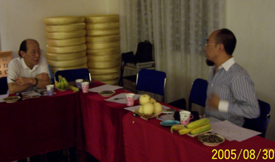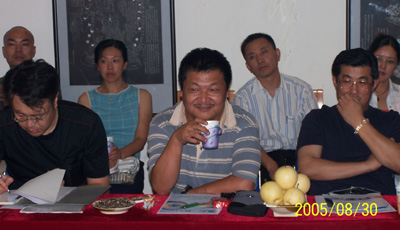 中国保健协会副秘书长贾亚光和香港澳美制药有限公司董事长陈泽阳 认真听取前烈立舒产品营销策划方案的讲解