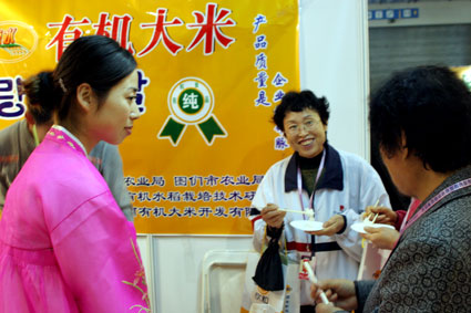 在延边高丽有机大米展区,参展商用《大长今》的主题曲和香喷喷的米饭吸引参观者。参展商向记者介绍,他们的“凉水”牌大米富含营养,产地位于长白山脚下,纯天然,无污染,是真正的健康食品。很多参观者品尝后都赞不绝口。
