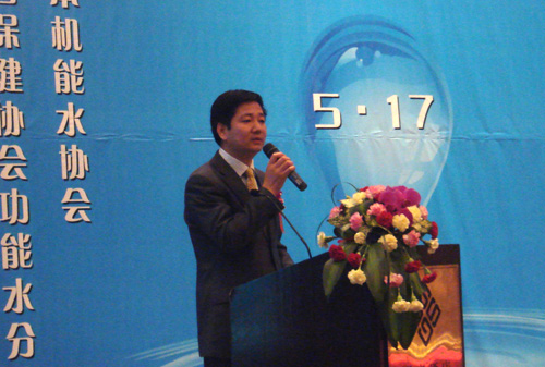 中国保健协会副理事长兼秘书长徐华锋讲话 会议由中国保健协会秘书长徐华锋、功能水分会会长李亚栋主持。 中国疾病控制预防中心环境与健康相关产品安全所所长、世界卫生组织西太区饮水工作组主席金银龙教授在会上介绍了中国水质的现状;中国保健协会秘书长徐华锋着重向与会者介绍了中国保健协会在中国功能水发展方面的工作重点,并呼吁广大业内企业与协会共同为中国功能水行业的宣传服务、市场推广等方面加强探讨与合作。同时,协会也将呼吁企业更加注重基础科研方面的研究,加强监督业内企业规范发展,加强配合政府主管部门对行业的管理控制,使行业更加发展壮大。日本国原厚生省大臣、中央总理大臣临时代理藤本孝雄致辞,并向与会代表介绍了日本政府对机能水行业的监管制度、相关功能认证以及政府对于机能水行业的重视程度。日本机能水研究振兴财团常务理事、事务局长堀田国元介绍了日本机能水的发展状况,重点阐述了机能水功效在日本确认的历程和现今广泛应用的范围。日本同志社女子大学药学部阿南节子博士还用亲身体验的实例向与会者介绍了日本功能水的研究案例。许多参会的中国功能水行业专家、企业代表也在会上就行业发展进行了相关的探讨。