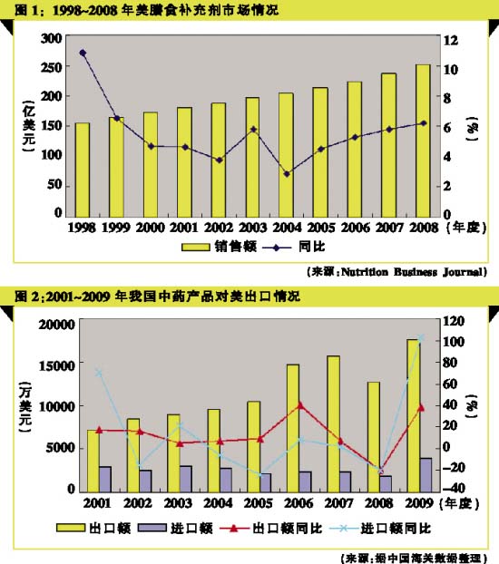 美国是全球最大的健康产品(包括膳食补充剂、天然&有机食品、功能性食品、个人&家庭护理产品)市场,其2008年的市场规模已达1040亿美元,同比增长8.8%,其中,膳食补充剂市场为251.8亿美元,同比增长6.2%,占比达25.3%。由于DSHEA设定的准入门槛较低,所以我国中药产品出口美国基本上都是按照膳食补充剂进行管理,并且多是作为膳食补充剂的原料。据中国海关数据统计,截至2009年,我国出口美国的中药类产品已达1.76亿美元,同比增长38.6%。