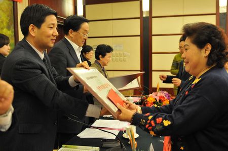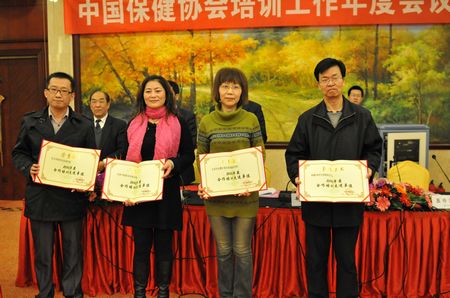 培训部张培荣主任做工作总结 会上,协会对在2010年度培训工作做出突出贡献的十个合作培训单位予以表彰,协会领导向他们颁发了《中国保健协会2010年度合作培训先进单位》荣誉证书,并为五个2008-2010年度连续获得表彰的合作培训先进单位进行了授牌和奖励。