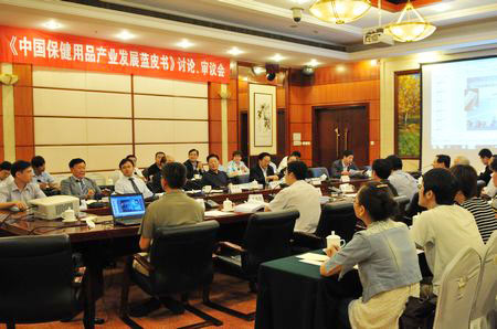 该《蓝皮书》初稿已完成,为更加全面完善本书,中国保健协会于2011年5月30日在北京召开了《中国保健用品产业发展蓝皮书》讨论、审议会。中国保健协会理事长张凤楼、副理事长兼秘书长徐华锋、副理事长栾成章、国务院国资委研究中心副主任彭建国、主任助理廖义全、国务院发展研究中心研究员、机械工业经济管理研究院副院长、总经济师徐东华、机械工业经济管理研究院产业经济研究室副主任副研究员、北大光华管理学院经济学博士、北京大学管理科学中心商业经济与管理研究所特邀研究员聂秀东、中国疾病预防控制中心环境与健康相关产品安全所所长、研究员金银龙、中国疾病预防控制中心环境与健康相关产品安全所研究员李亚栋、财政部财政科学研究所副研究员王志刚、原中国保健食品协会副会长、中国保健协会科普教育分会名誉会长、研究员刘建文、中国保健协会兼职副理事长、南京中脉科技发展有限公司董事长王尤山、董事长助理孙军、广东紫薇星实业有限公司副总刘东生、办公室主任黄礼群、山东康泰实业有限公司董事长康炳元、办公室主任苗志华等从事保健用品的会员企业代表以及协会秘书处等相关工作人员参加了本次会议。  与会领导、专家发言