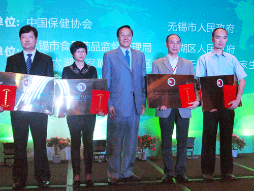 优秀的企业需要相关制度的保驾护航。为了维护优质企业的利益,让它们的发展能得到各方的有力支持,从2005年开始,经商务部批准,中国保健协会启动了企业信用等级评价工作,未来企业信用等级将成为行业新的门槛,最终会成为企业生存的一个重要要素。因此,“保健行业信用等级评价工作介绍及2012评价结果发布” 在本次研讨会上压轴推出,也显示了主办方力图为中国保健食品企业的可持续发展提供一个相对完善的标杆。中国保健协会常务副理事长秦小明介绍了保健行业信用等级评价工作的最新进展,张凤楼理事长则为杭州海王生物工程有限公司、广东环西生物科技股份有限公司、浙江康恩贝集团医疗保健品有限公司和广东紫薇星实业有限公司四家获得AAA级信用评级的企业颁牌及证书。 当日下午,中国(无锡)保健产业园正式落户无锡(马山)国家生命科学园。中国保健协会张凤楼理事长、无锡市市长朱克江、国家食品药品监督管理局保化司司长童敏、无锡市滨湖区书记朱渭平一起为产业园揭牌,中国(无锡)保健产业园得到了相关部门的高度评价,张凤楼理事长称这是无锡在打造生物医药产业上最有远见的措施之一,也是保健食品产业集群发展的重要举措。朱克江市长向与会保健食品企业发出邀请,欢迎到无锡投资建厂,无锡将为中国保健食品产业的良性可持续发展提供完善和周到的服务。 据无锡(马山)国家生命科学园相关负责人透露,中国(无锡)保健产业园挂牌之后,园区将筹备建立中国保健产业发展联盟和国家级保健食品安全评价中心,并将腾出2万平方米载体用于孵化处于初创期的保健食品企业。未来两年,入驻产业园的健康保健企业将有望达100家。  参会领导为四家获得AAA级信用评级的企业颁牌及证书