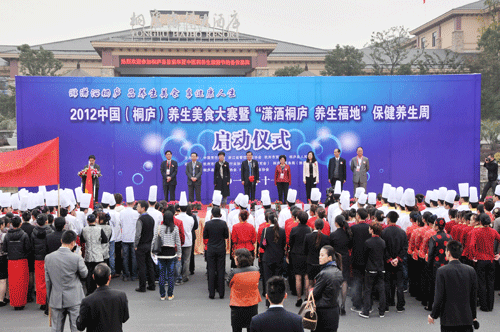 省政协副主席王永昌宣布首届华夏中医药养生旅游节开幕,原省政协副主席、现省企业联合会、企业家协会会长张蔚文宣读全国政协副主席阿不来提•阿不都热西提的贺信,国家中医药管理局党组成员、副局长吴刚和杭州市副市长陈小平分别致辞。中国保健协会理事长张凤楼、副理事长牛忠俊,原浙江省军区副司令员、现浙江省休闲养生协会主席李金国,国务院参事室国学基金会秘书长陈捷延,全国老龄工作委员会办公室主任助理曾琦,原浙江省委副秘书长、农办主任,现浙江省企业联合会、企业家协会常务副会长夏阿国,原浙江省建设厅副厅长、现浙江省房地产协会会长贾宝林,浙江省建设投资集团副董事长、总经理高兴夫等应邀出席开幕式。杭州市人民政府副秘书长徐一超主持开幕式。 出席开幕式的还有,中国烹饪协会副会长李亚光,中国中药行业协会执行副会长王瑛,中国医药企业管理协会副会长赵博文,省卫生厅副厅长张平,省食品药品监督管理局副局长吴宁一,省中医药管理局局长徐伟伟,省旅游局副巡视员徐海,市旅委主任李虹,省医药行业协会会长郭泰鸿,市食品药品监督管理局副局长童天云,省经济规划院专家委员会委员何思源以及省市餐饮协会、企业家协会代表,学者专家,全国中华餐饮名店代表,部分客商代表和项目签约代表,境外、中央、省市新闻媒体记者等。 毛溪浩代表县四套班子和40万桐庐人民对各位领导和嘉宾的到来表示热烈欢迎和衷心感谢。在介绍我县经济社会发展情况和今后一个时期的发展思路、发展理念后,毛溪浩指出,桐庐是“药祖之乡•中医之源”,我县举办首届华夏中医药养生旅游节,以此隆重纪念桐君老人,继承桐君悬壶济世、治病救民、乐于助人的高尚品格,传承药祖桐君美德,为打造人文桐庐、建设文化强县增添动力。同时,大力弘扬传统中药文化,推动中医药文化和中医药产业大发展大繁荣,为中医药文化走出国门、走向世界作出桐庐应有的贡献。